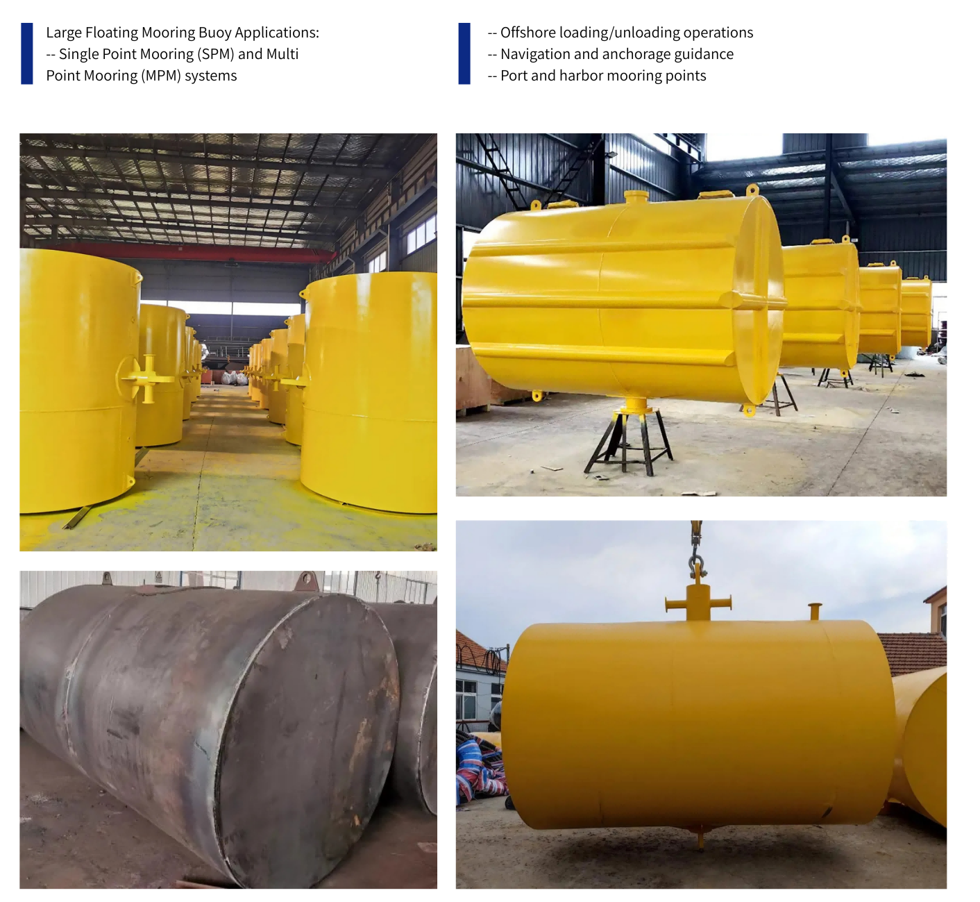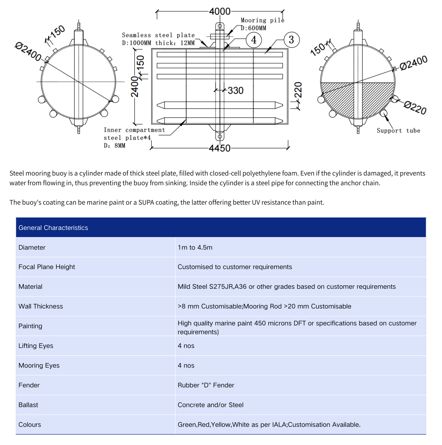 Steel Mooring and Support Buoys, also known as water drum buoys, are important devices for vessel anchoring, floating on the water surface with anchor chain through it. The ship can do follow work after anchored with mooring buoys: recharging, sheltering, degausing, etc.