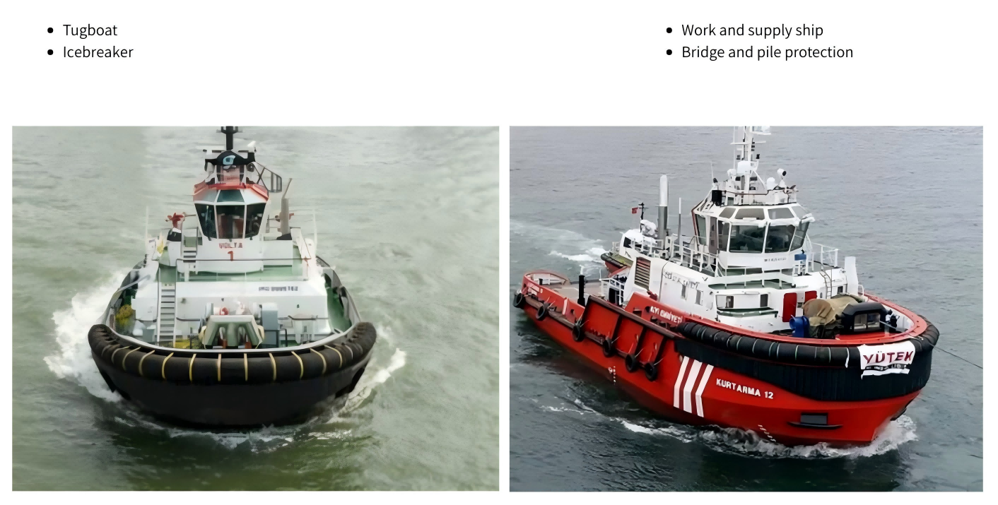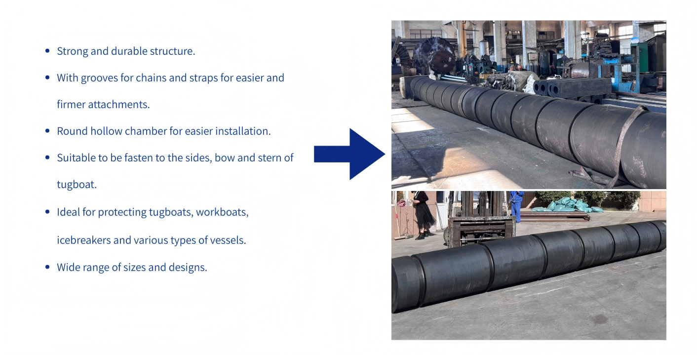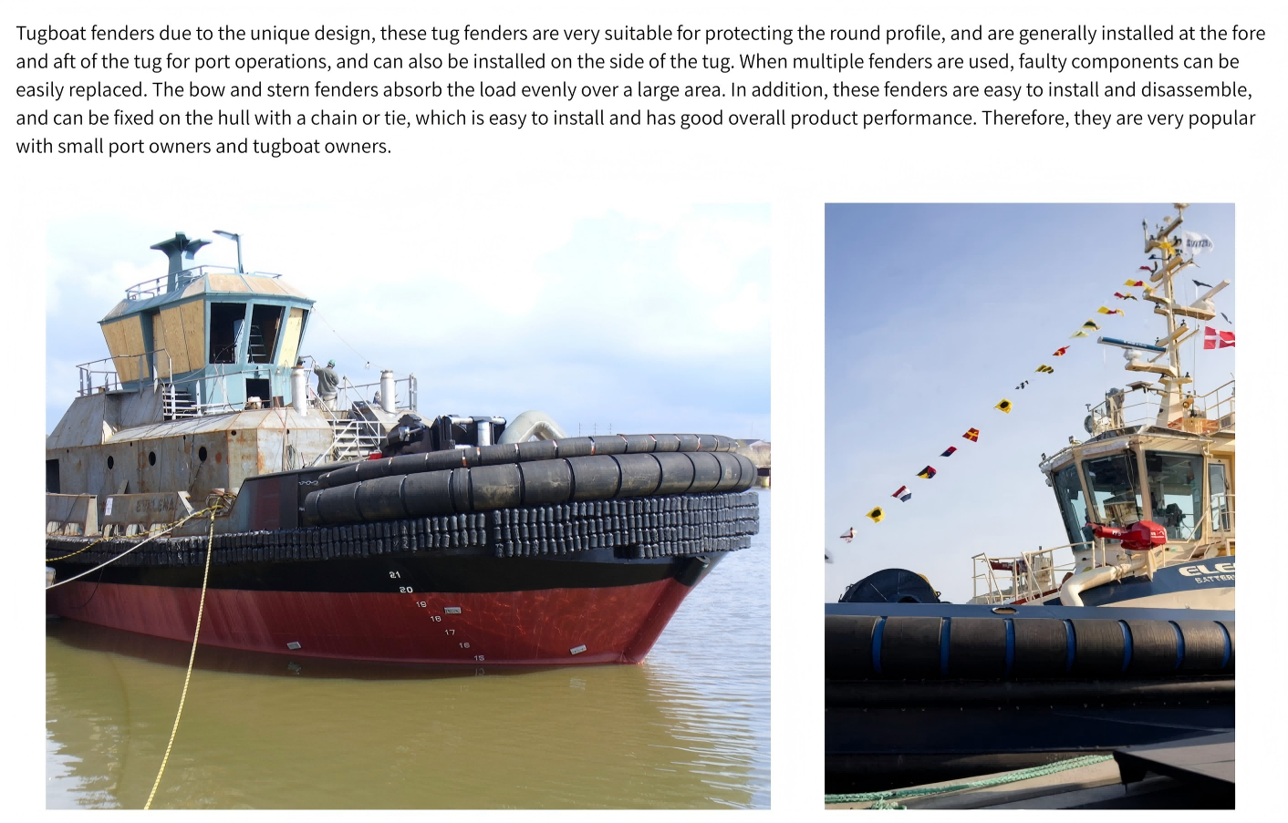 Tugboat fender is a cylindrical fender used for various tugboats for pushing, erecting, extending and slanting operations. The tugboat rubber fender adopts vulcanization technology, which has good performance, long service life and easy installation.