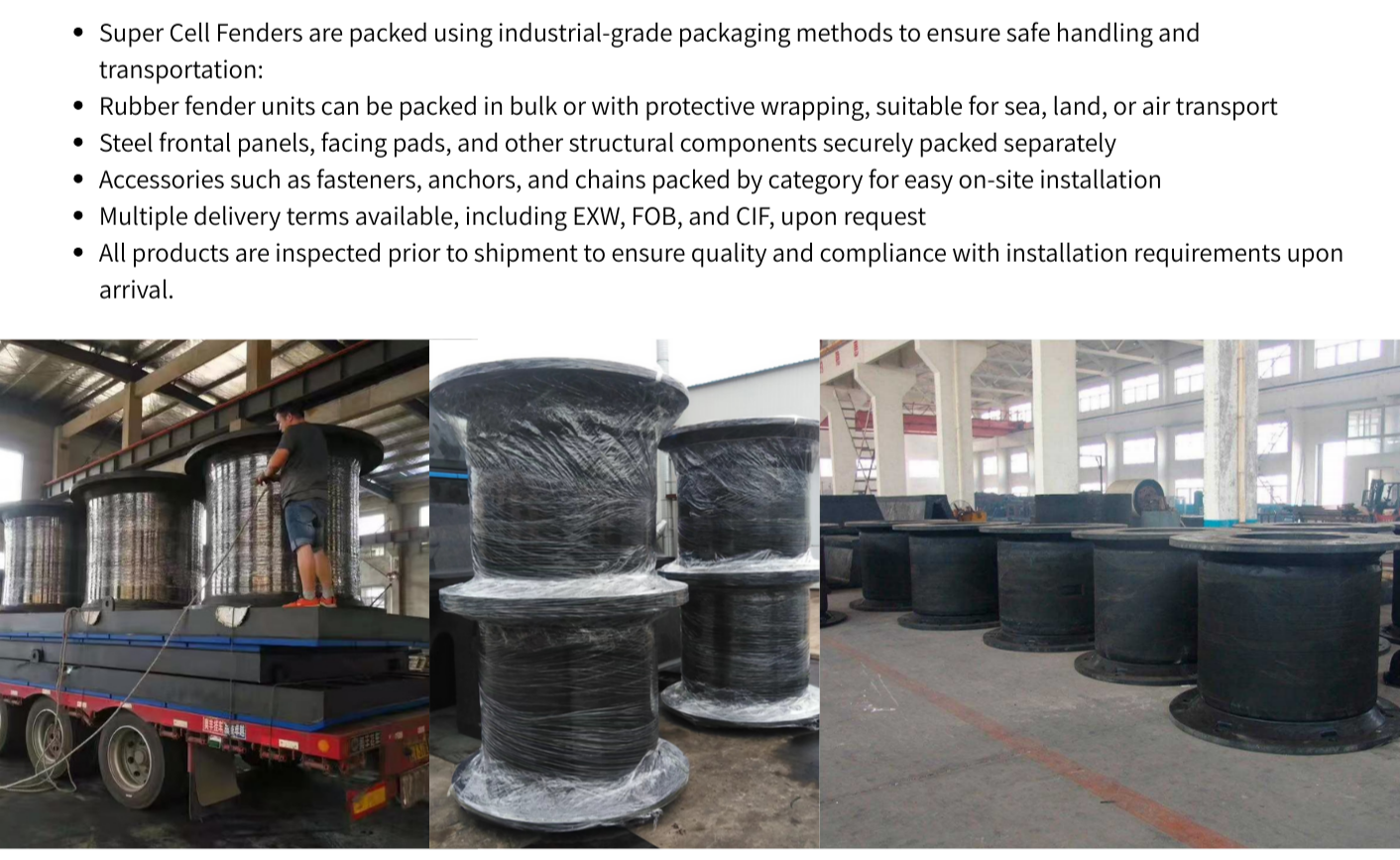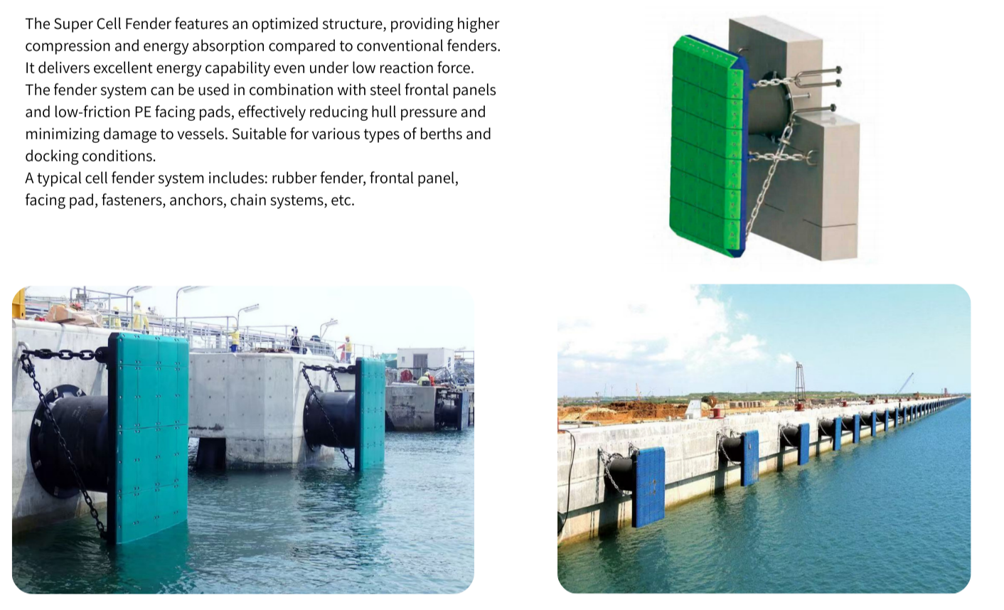 Cell fenders are mostly installed for docks (Dock medium type to VLCC) where Reaction Force is an important criteria. Among all types of fenders, Cell fenders offer minimum reaction per ton-meter energy absorbed. The very geometrical shape gives it sturdiness, shear resistance, compact structure and the capacity to absorb energy equally from all directions.